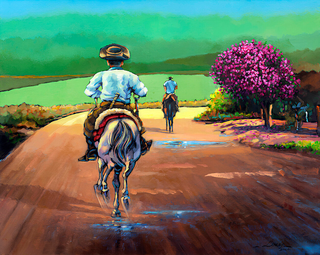 Através do desenho e da pintura, com pinceladas e cores surgem obras em tinta acrílica sobre tela, inspiradas em paisagens e cenas do Rio Grande do Sul, buscando materializar o cotidiano de nossa gente, em suas mais diversas atividades, enfocando situações e personagens que encarnam nossas raízes com o indisfarçável orgulho de ser Gaúcho.